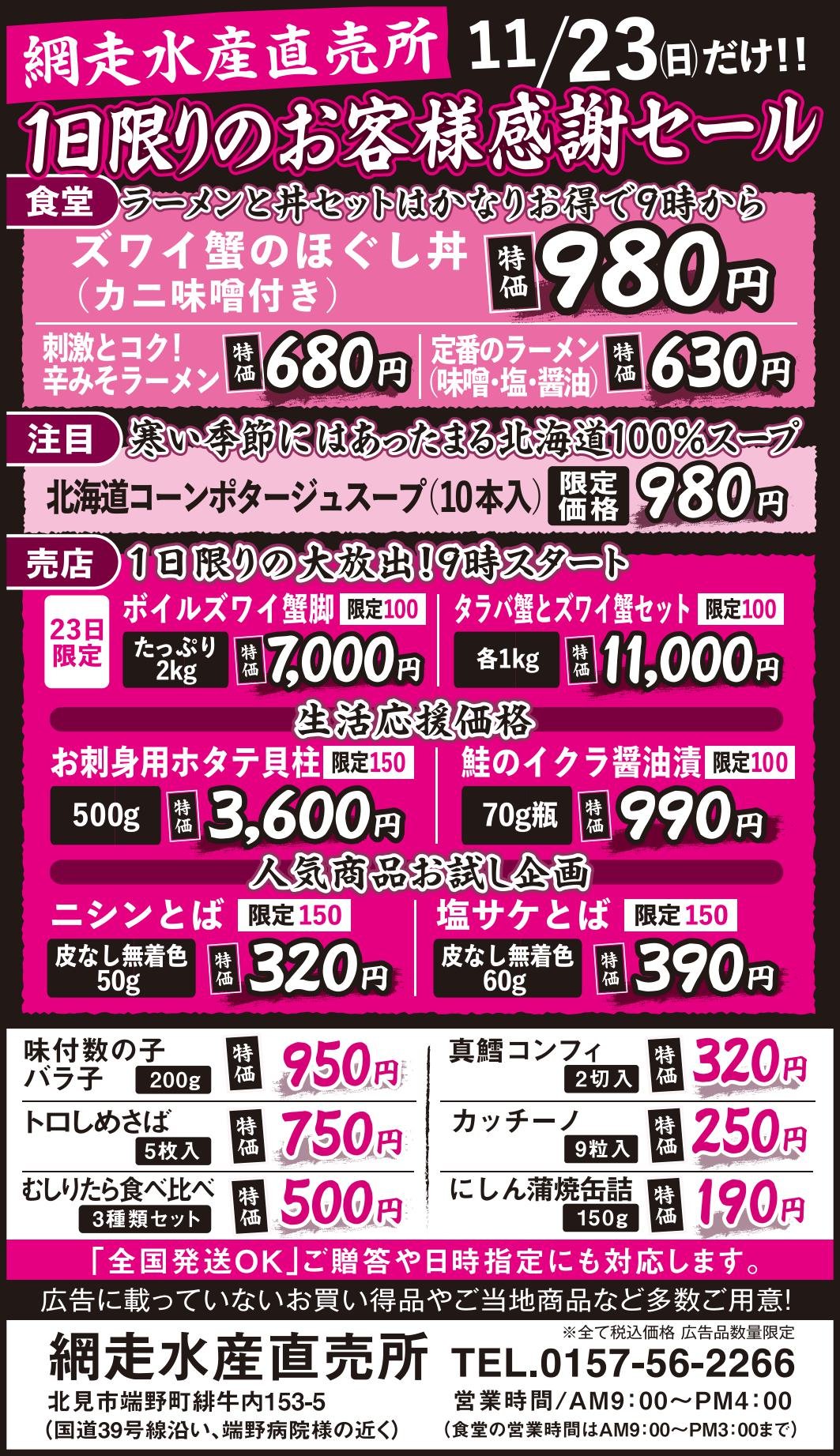 1日限りの大放出!23日はお客様感謝セールです 網走水産直売所では11月23日(日)の1日限りでイベントを開催! 今回は生活応援商品と人気商品のお試し企画を特別チョイス♪ これからの寒い時期には身体の芯から温まる北海道1 […]