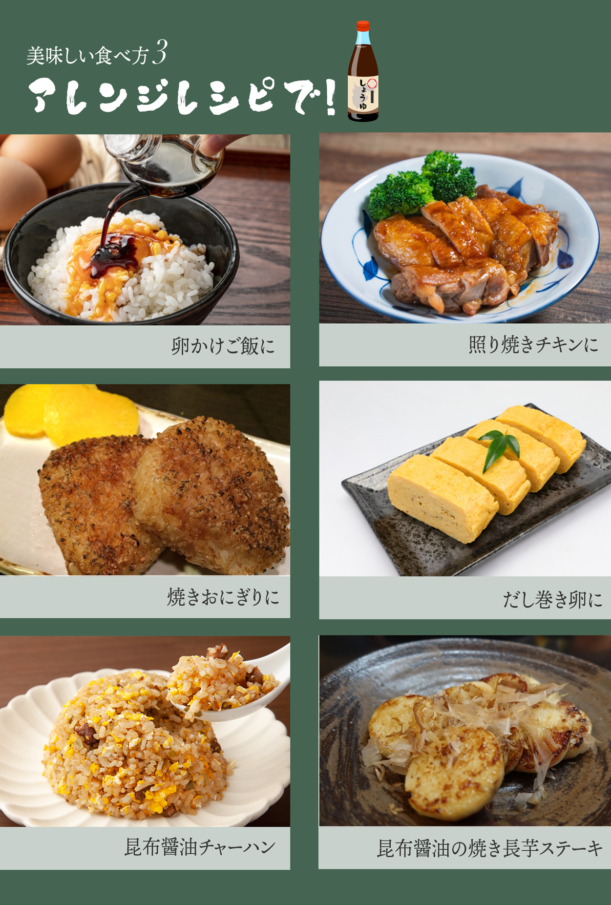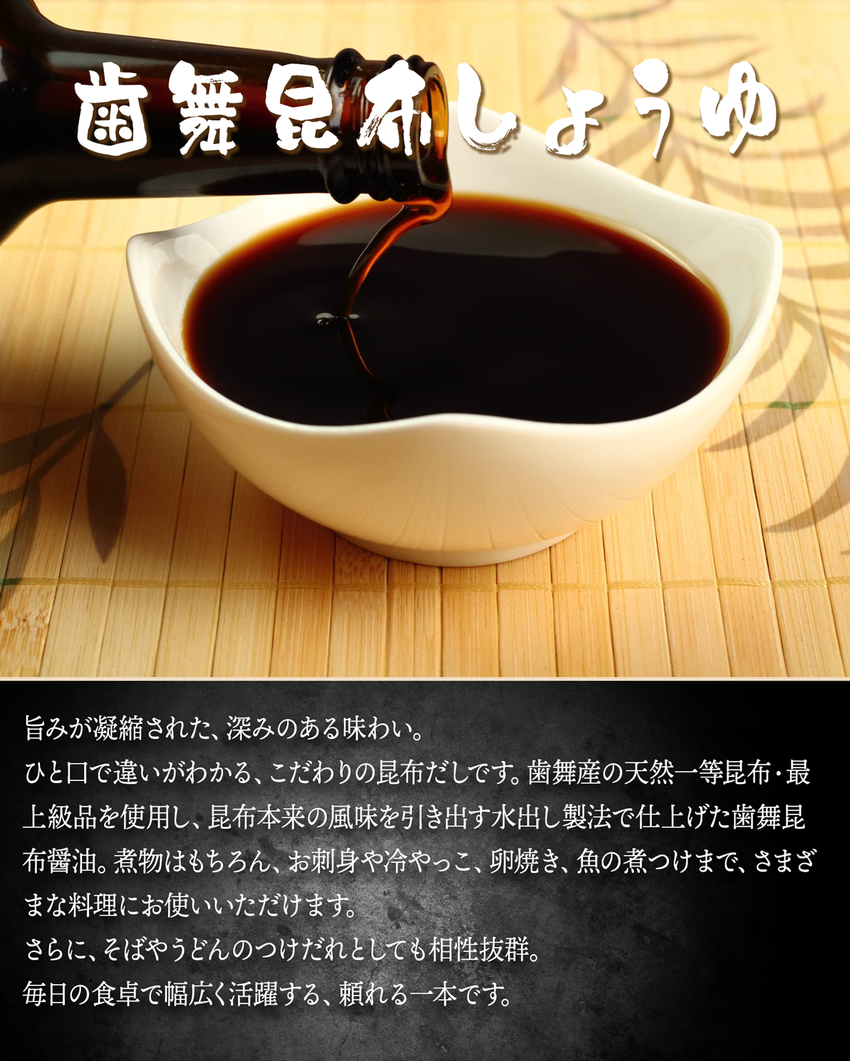 昆布の旨みを凝縮しまろやかに仕上げているので、どんな料理とも相性がよく料理が引き立つ風味豊かなお醤油です。
