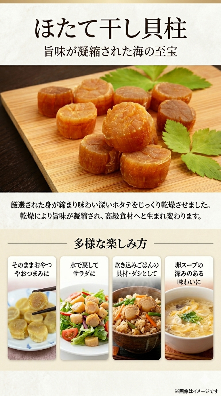 身が締まり味わい深い厳選されたホタテを乾燥させることにより、より旨味が凝縮され高級食材へと生まれ変わります。