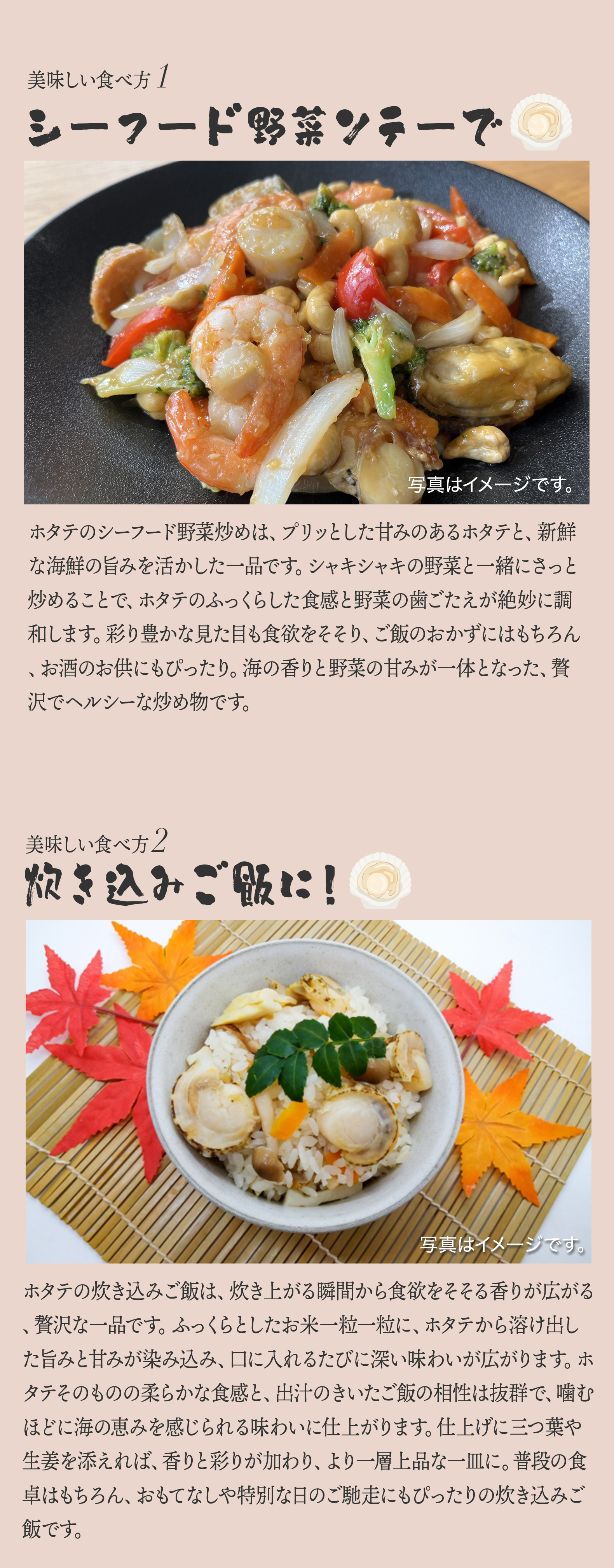 かき揚げ・バター焼き・フライ・かき揚げ・炒め物・八宝菜など様々なメニューで召し上がれます。