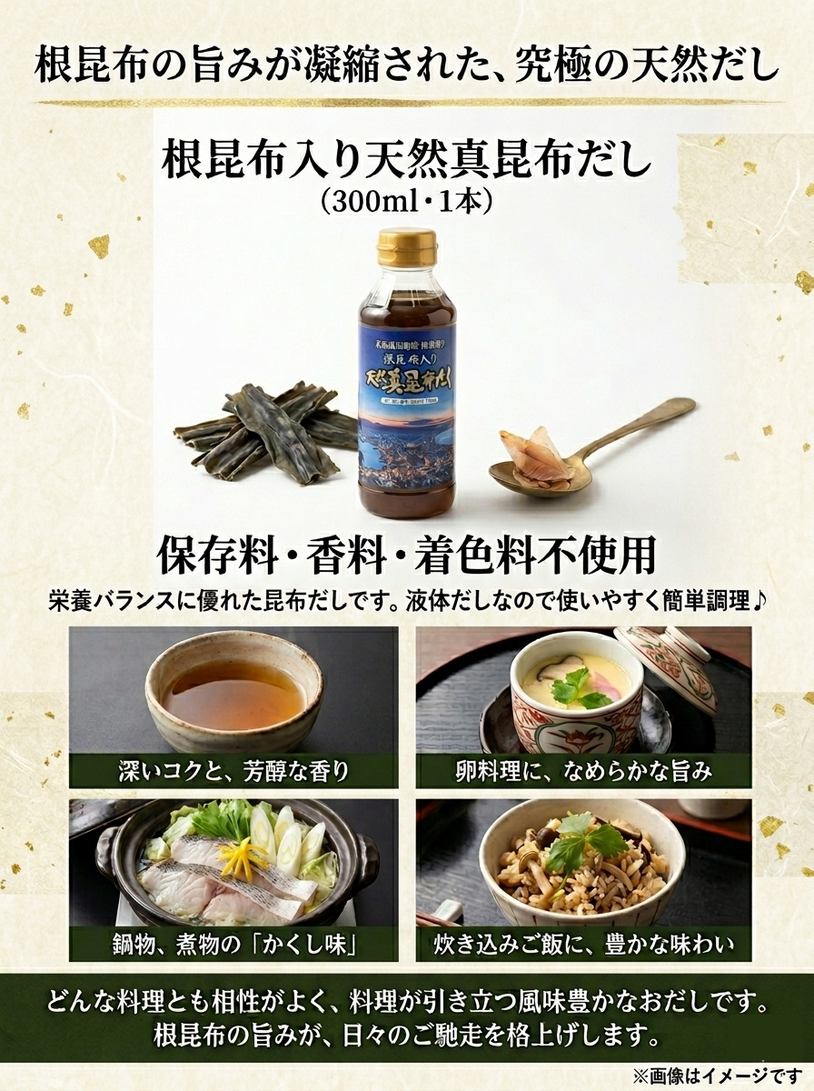 根昆布の旨みが凝縮され、どんな料理とも相性がよく料理が引き立つ風味豊かなおだしです。