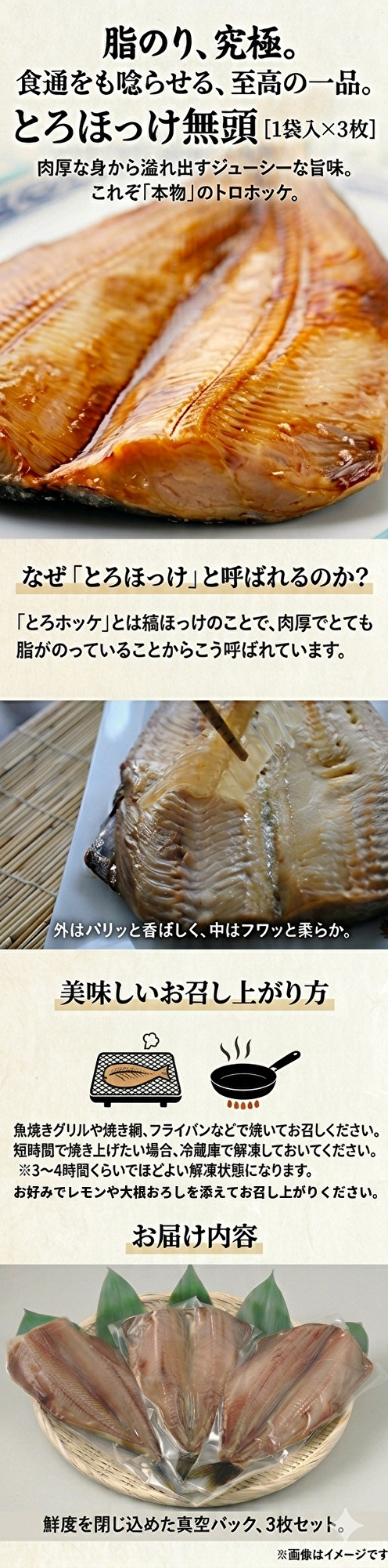 フワッと肉厚でジューシーな脂ノリ 791(F791) <今月の目玉・限定500>とろほっけ無頭 1枚入×3袋