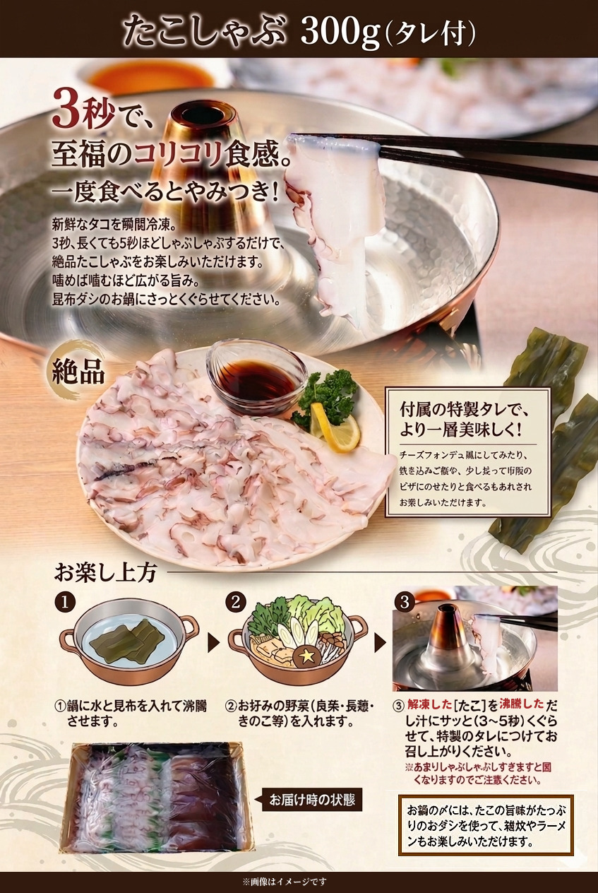 新鮮なタコを瞬間冷凍してありますので、3秒、長くても5秒ほどしゃぶしゃぶするだけでコリッコリの食感と甘味が堪能できる絶品たこしゃぶがお楽しみいただけます。