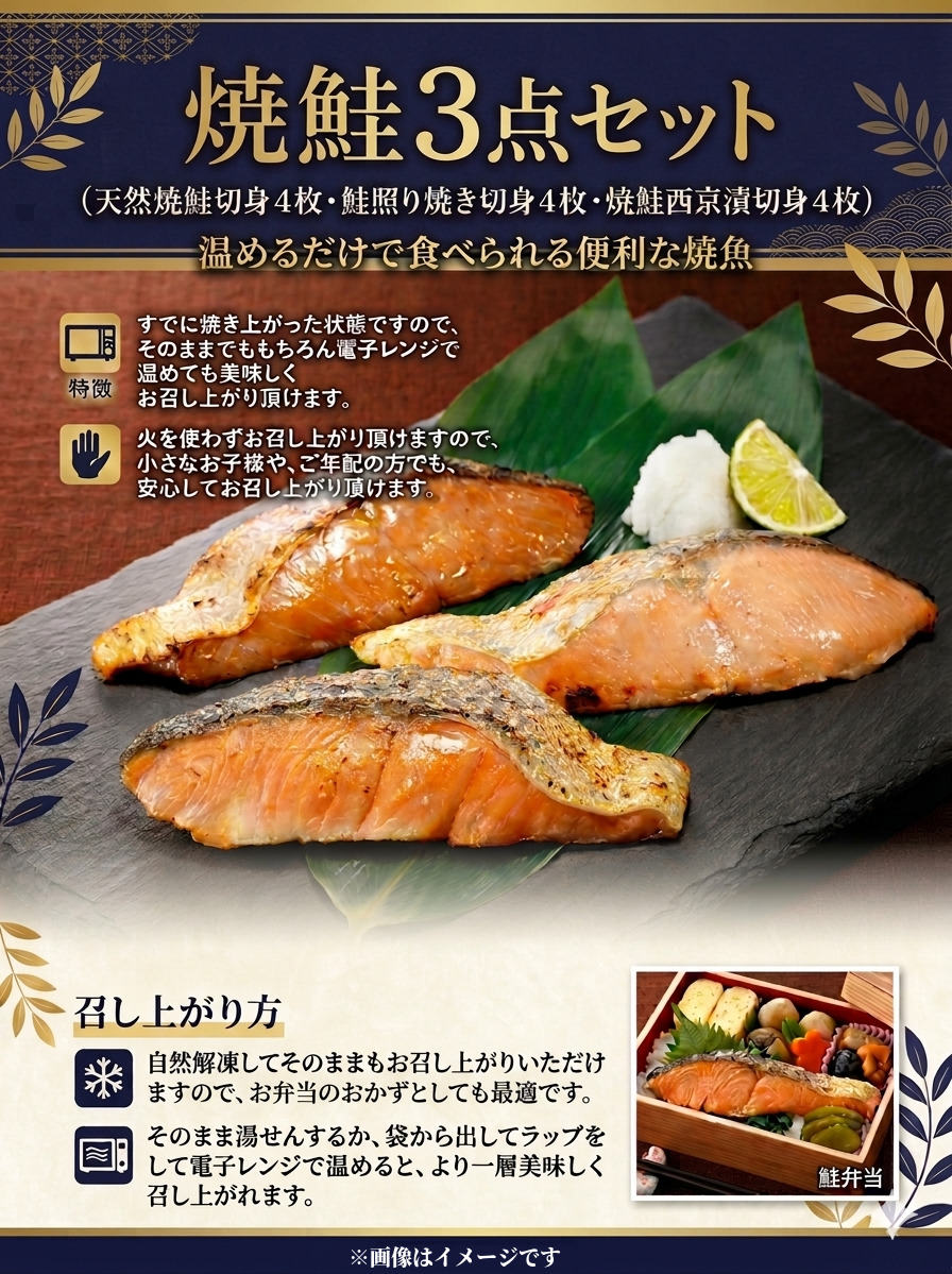 焼いてあるので温めるだけで手間なく食べられる 548(F548) <便利な焼魚シリーズ> 焼鮭3点セット