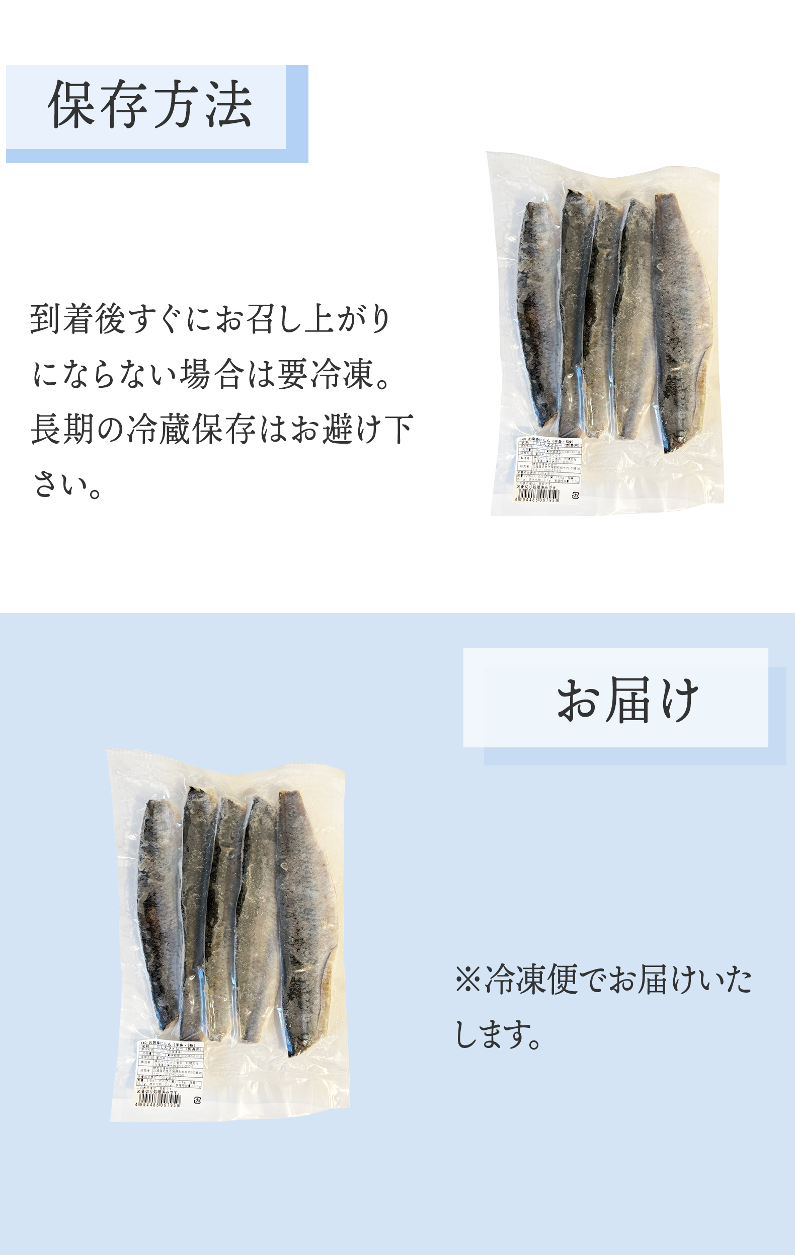到着後すぐにお召し上がりにならない場合は要冷凍。 長期の冷蔵保存はお避け下さい。