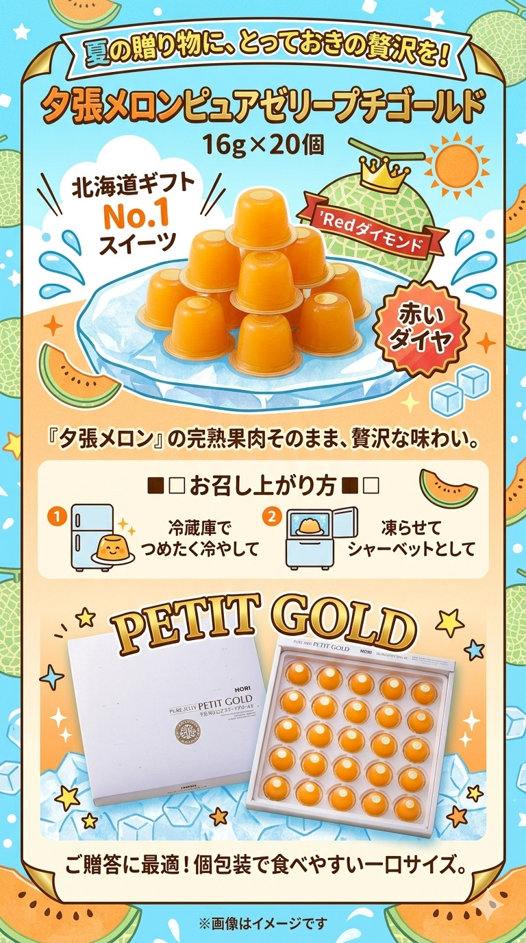 ホーム > お中元ギフト > 388(B388) <オンラインショップ限定>夕張メロンピュアゼリー プチゴールド 16g×20個