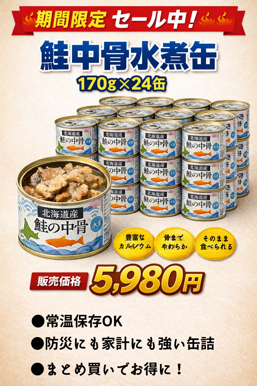 カルシウム補給にも非常食にも!お得にまとめ買い 008(B008) <オンラインショップ限定・「骨活」に一役!24缶でお得>鮭中骨水煮缶 170g×24缶(1箱)