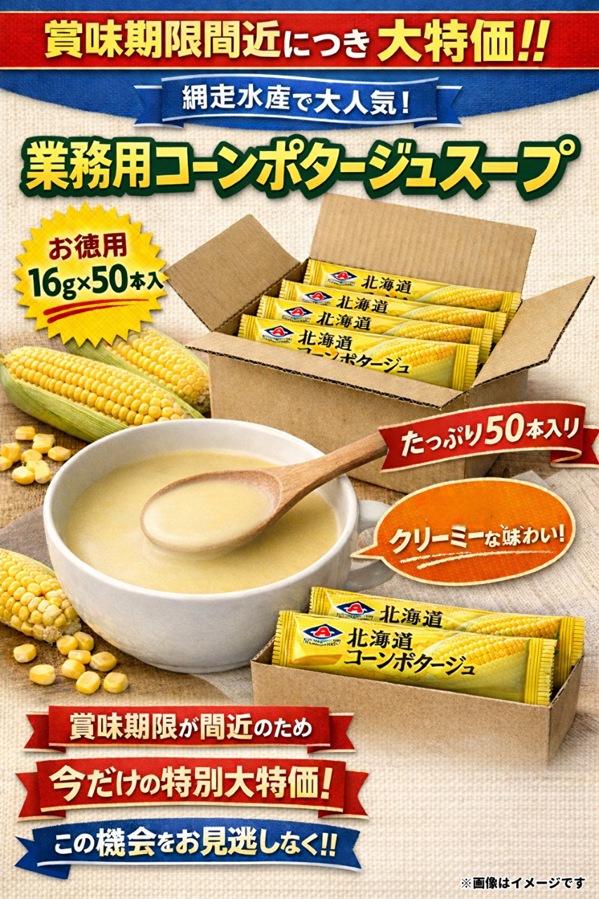 北海道産スイートコーンを100%使用した網走水産人気のコーンスープを50本をお得にお届けします!